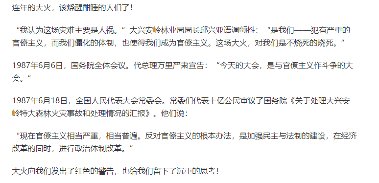 一直到2007年,大兴安岭又发生火灾的时候,当年的人祸还被拿出来当作例子,要求当地林管局进行反思: