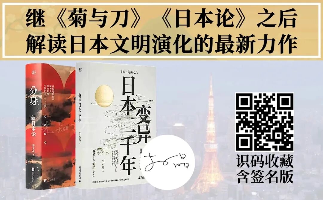 这是两本解读日本文明演化的最新力作。李永晶是东京大学博士,他旅日十年,被称为新一代“知日派”人士,是新一代日本研究代表学者。他对日本的解读令人耳目一新。读他的书就能真正理解中日两国几百年间连绵不绝的爱恨情仇。先知书店有幸获得李永晶老师新书《变异:日本二千年》的签名版,殊为不易,识别下图二维码,即可一键收藏。