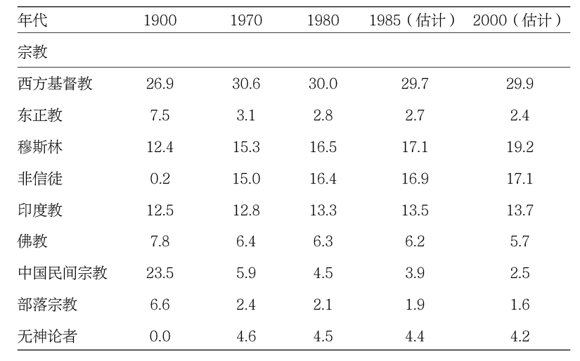 一种普遍宗教出现的可能性比一种普遍语言出现的可能性大不了多少。20世纪末宗教在世界各地出现了全球性的复兴,这一复兴包含了宗教意识的加强和原教旨主义运动的兴起,它因此扩大了宗教之间的差异。宗教复兴不一定包含信奉不同宗教的人口的重大变化。关于信教者的数据甚至比关于讲某种语言者的数据更不完整,也更不可靠。表3.3 世界人口信奉主要宗教传统的比例(百分比)资料来源:戴维·巴雷特主编:《世界基督教百科:公元1900—2000年现代世界各教会和各宗教比较研究》(牛津大学出版社,1982年版)。