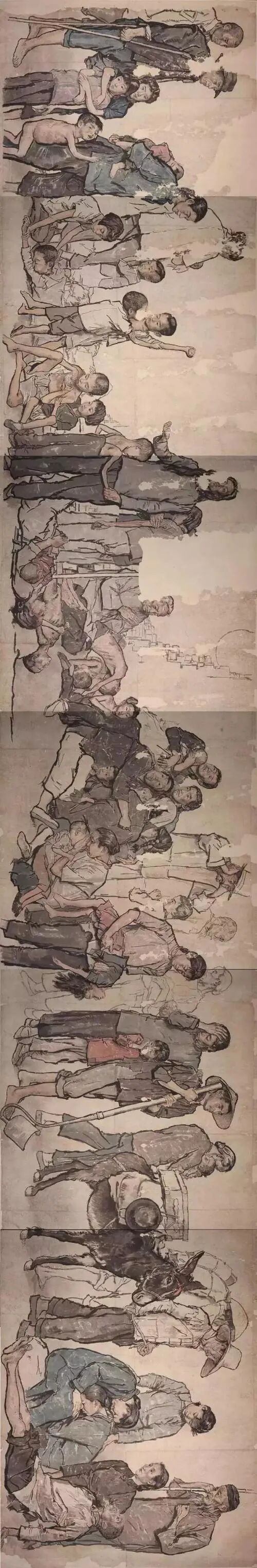 1953年,《流民图》神奇地被找到了,回到蒋兆和手里,但整个长卷已经残缺不全。1957年,《流民图》赴苏联展览。1959年,中国革命博物馆借取《流民图》展览,康生指此画“调子太低”,未能展示。“文革”中,《流民图》被定性为“反共卖国的大毒草”,险些销毁。“文革”后,这幅残破的画在仓库角落被发现,我初次见到真迹,就在人民美术出版社的昏暗走廊。1979年,中央美术学院做出结论报请文化部党组批准,始获评定,称其为“现实主义的爱国主义作品”。