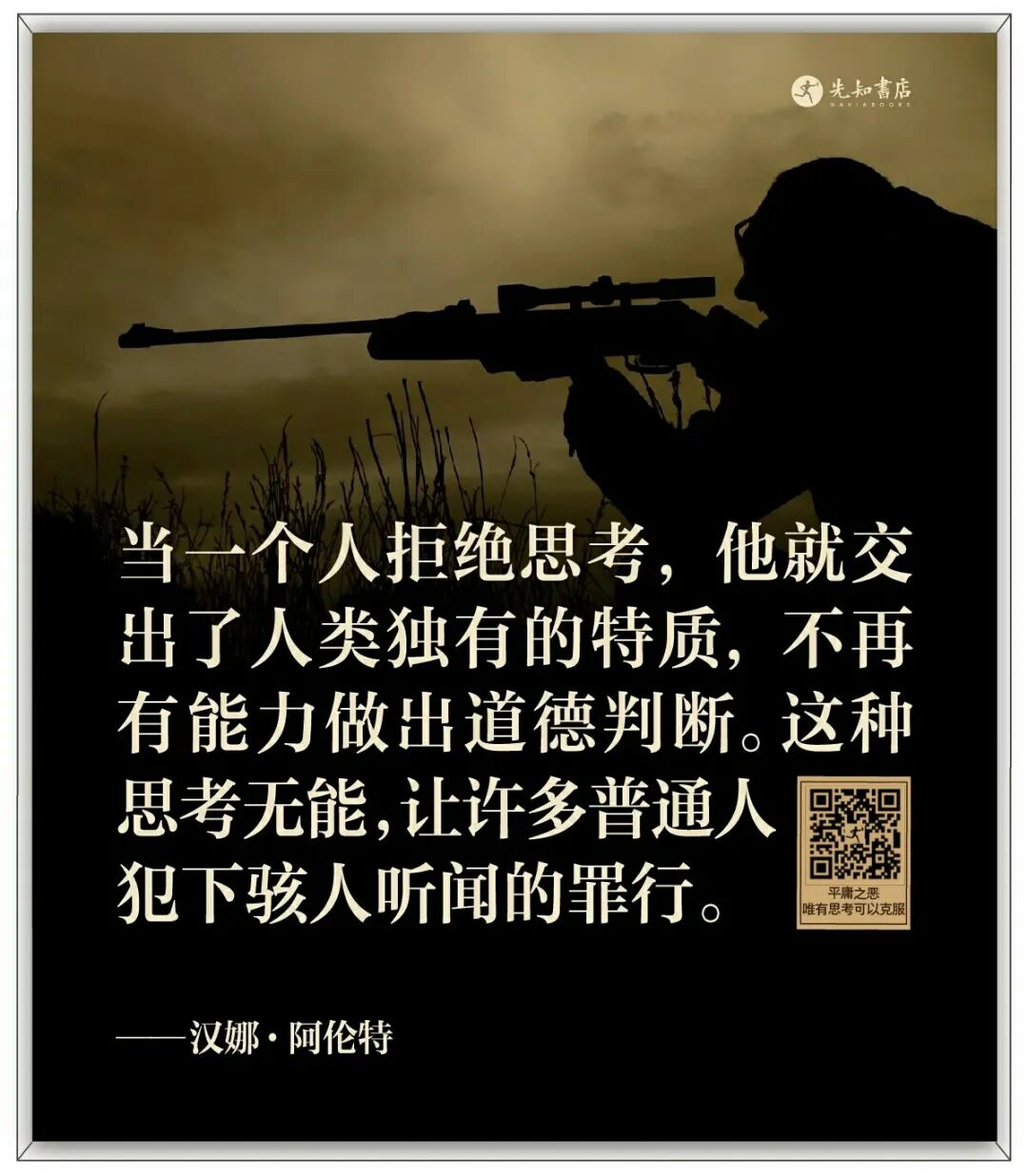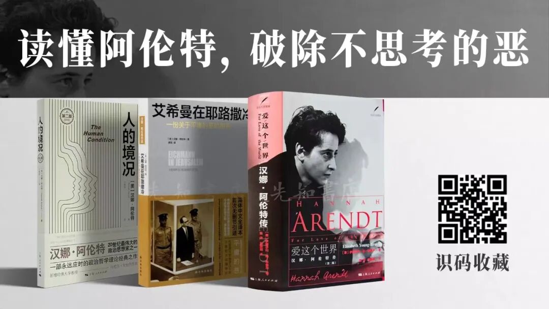 为此,先知书店特别推荐“阿伦特作品集”,阅读阿伦特,寻找人性觉醒的光辉,警惕强权之恶,告别平庸之恶。识别下图二维码,即可一键收藏。(还可在规格中一并选购“西方现代思想史”书单系列,含独家)。