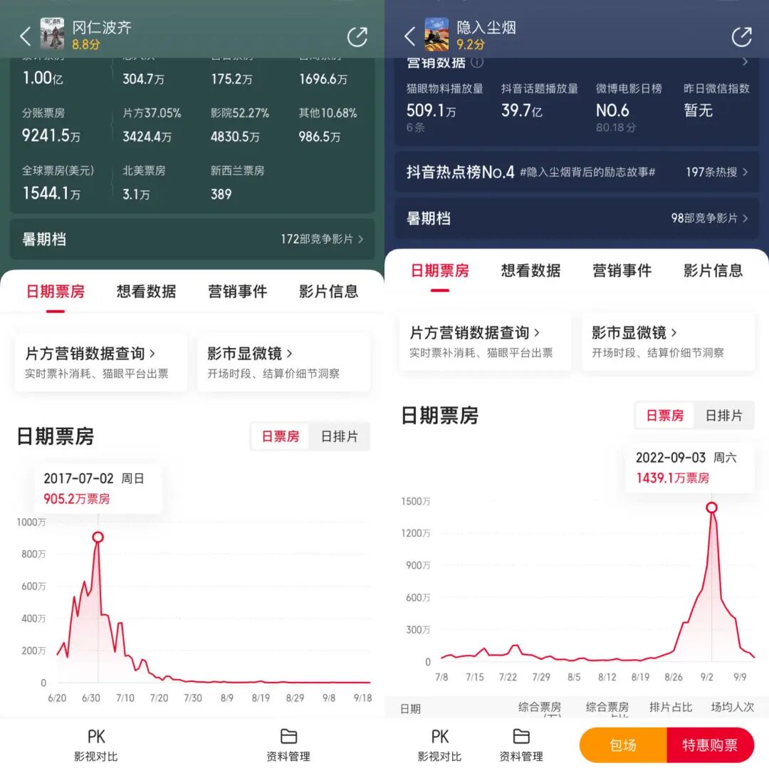 7月8日上映的《隐入尘烟》,就是一个文艺佳作票房逆袭的案例。这部上映初期宣发默默无闻的电影,在8月上线流媒体后,才获得了KOL自来水式的二创传播,因此在两个月后的9月3日才达到了日票房的顶峰1439.1万元。