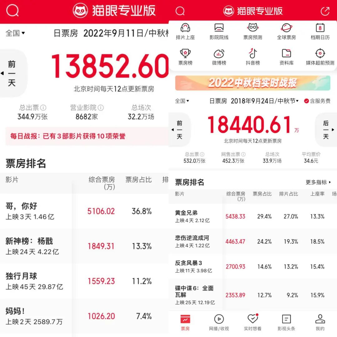 此前,中秋档票房达到了5.31亿元的2018年,票房的前四名《黄金兄弟》《悲伤逆流成河》《反贪风暴3》和《碟中谍6:全面瓦解》,在档期中最后一日的票房占比分别为29.4%、24.2%、14.6%和12.7%,票房属于 “全面开花” 型,并且影片类型都属于受众关注度广的大制作、动作或者谍战片。
