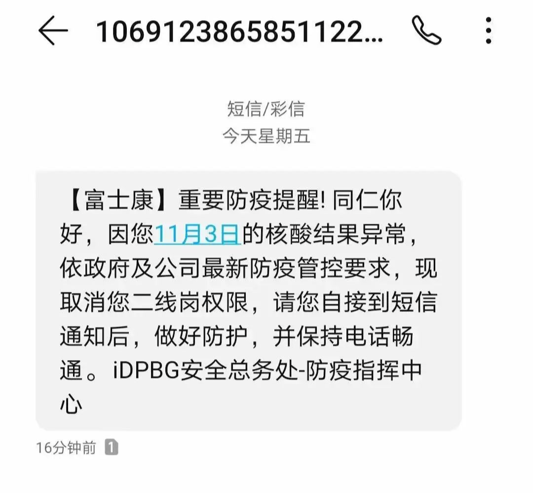“我们宿舍区是(疫情)最严重的,其他宿舍区只是个别房间贴封条,我们直接封控了。”他回忆道,富士康疫情刚开始的时候,有“密接”就会给宿舍贴封条,后来“密接”太多了,确诊阳性的才拉走隔离,其他人继续上班。