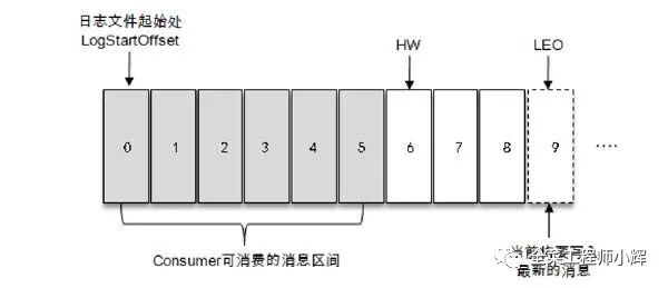 LEO是Log End Offset的缩写,它标识当前日志文件中下一条待写入消息的Offset,图中Offset为9的位置即为当前日志文件的LEO,LEO的大小相当于当前日志分区中最后一条消息的Offset值加1。分区ISR集合中的每个副本都会维护自身的LEO,而ISR集合中最小的LEO即为分区的HW,对消费者而言只能消费HW之前的消息。