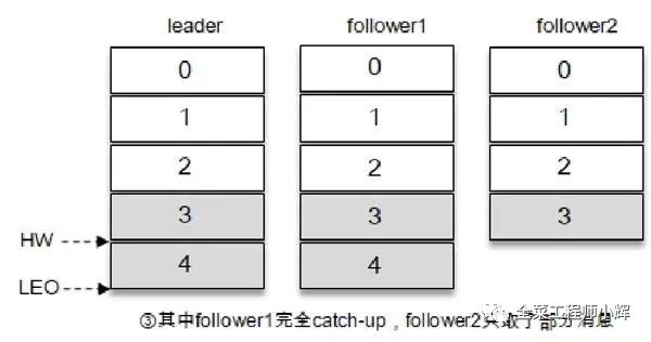 在同步过程中,不同的Follower副本的同步效率也不尽相同。在某一时刻Follower1完全跟上了Leader副本而Follower2只同步了消息3,如此Leader副本的LEO为5,Follower1的LEO为5,Follower2的LEO为4,那么当前分区的HW取最小值4,此时消费者可以消费到offset为0至3之间的消息。