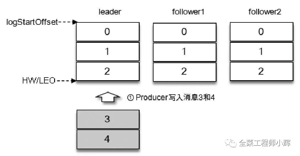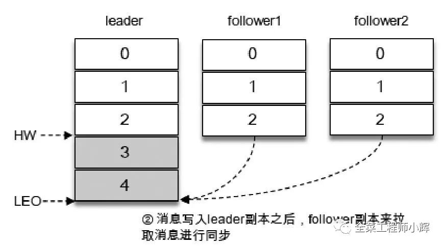 如图所示,假设某个分区的ISR集合中有3个副本,即一个Leader副本和2个Follower副本,此时分区的LEO和HW都为3。消息3和消息4从生产者发出之后会被先存入Leader副本。