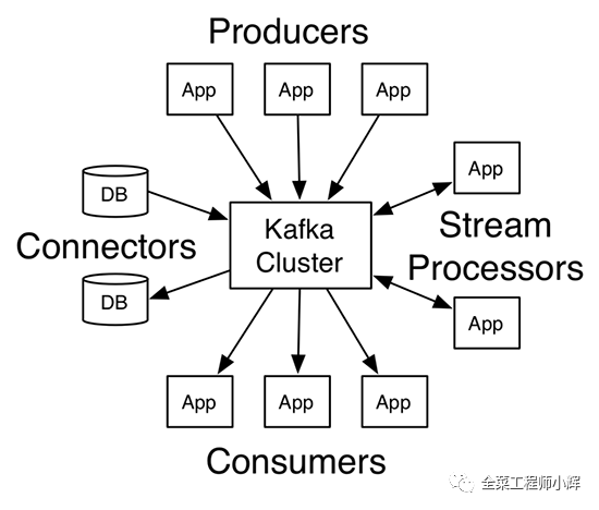 Connector API:可构建或运行可重用的生产者或消费者,将topic连接到现有的应用程序或数据系统。例如,连接到关系数据库的连接器可以捕获表的每个变更。