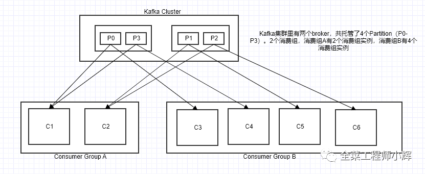 Consumer Group:对于同一个Topic,会广播给不同的Group。在一个Group中,一条消息只能被消费组中一个的Consumer消费。