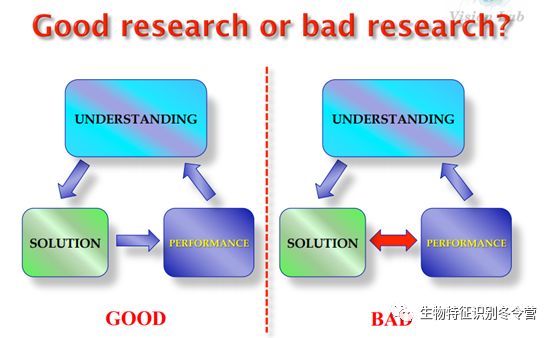 针对这些挑战,Prof. Tistarelli 讲了如何去做好研究?什么是好的研究方法?什么是不好的研究方法?如图三所示,好的研究方法应该是单向循环的,包括理解好问题、设计解决方案、做实验测性能三个环节。而不好的研究方法通常在设计解决方案和做实验测性能两个环节进行死循环,而没有去真正发现问题。