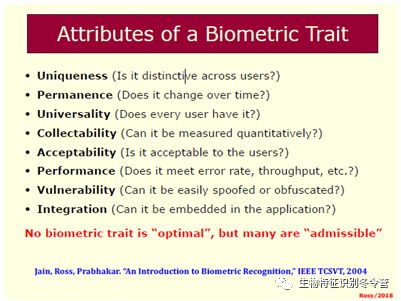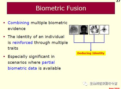 接着,Ross给我们总结了生物特征识别中特征的属性并得出了结论——没有一种生物特征是完美的(最优的),大部分还是可以接受的。所以是时候停止关于那种模式分类技术是最好的争论了!因为这是要取决于我们具体的上下文环境和目标的。所以我们应该站在更高的角度来辩证的去看,要学会把这些特征方法融合在一起,并且根据具体情况来扬长避短因地制宜地去应用。于是这就引入了这场Lecture的第一个重点——生物特征信息融合(Biometric Fusion)。