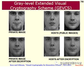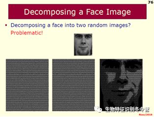 紧接着Ross介绍了一个Visual Cryptography方法来分解图片。面部图片、指纹图片就可以用Visual Cryptography的方法分解成两个随机的图片