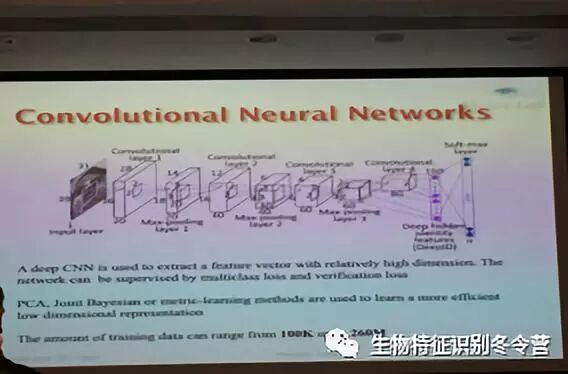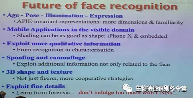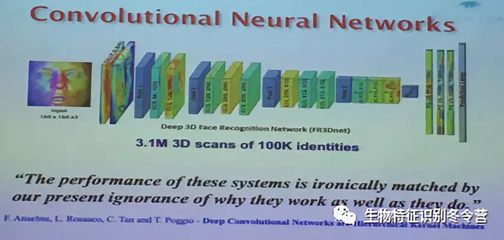 接下来,MassimoTistarelli教授为大家讲解了人脸识别技术的不同类别,分别介绍了基于整体外观信息的人脸分析方法,主要算法有PCA、LDA、ICA等;还有基于局部特征点的分析手段,主要算法有Gabor、SIFT、SURF等。此外,教授还介绍了3D人脸识别的相关技术手段及发展现状,进而引出了近年来十分火热的深度学习方法——基于CNN的人脸识别技术。但是基于深度学习方法的识别效果十分依赖训练数据集的大小,而且至今人们都无法对其模型本质进行有效的解释。