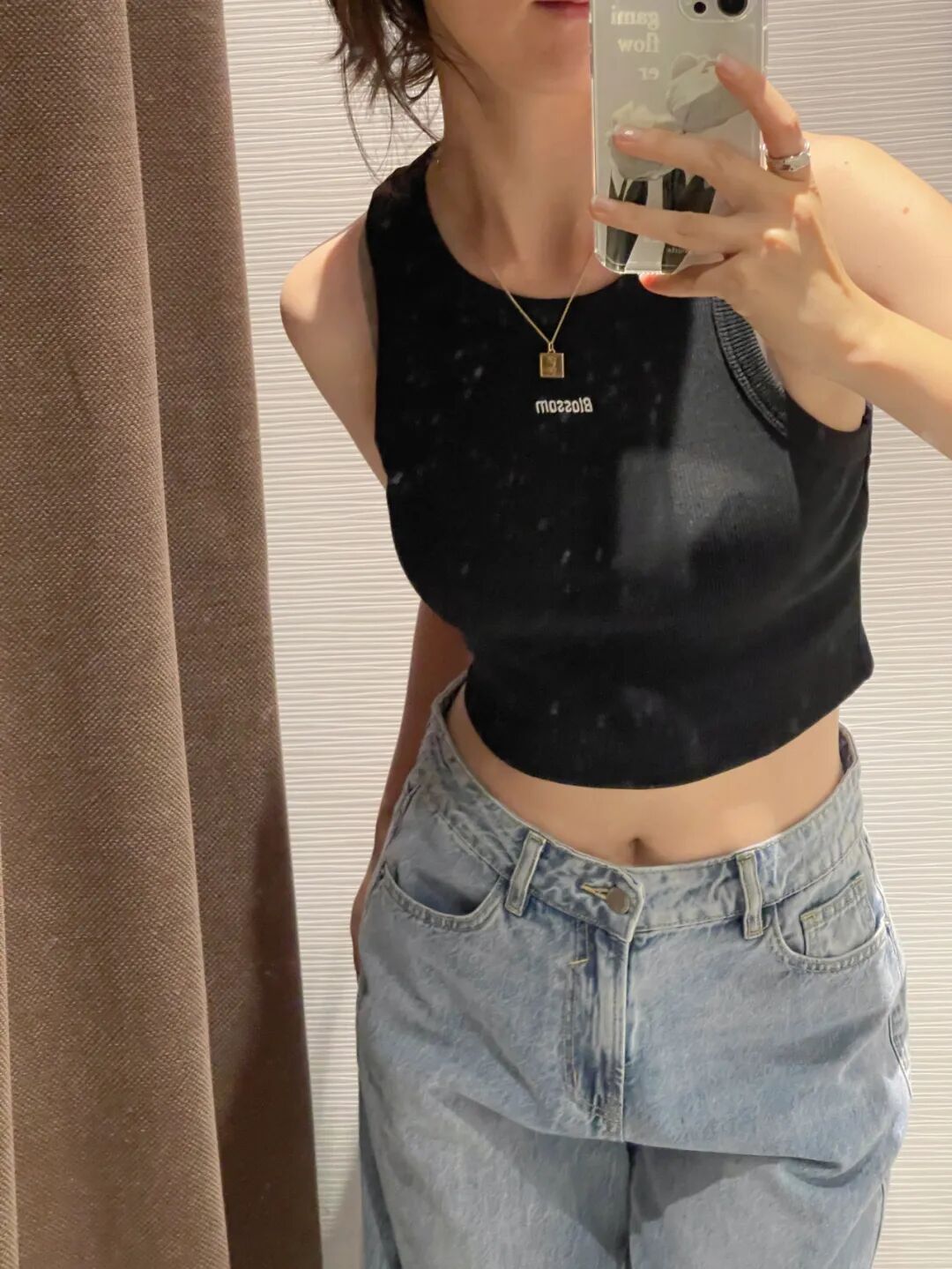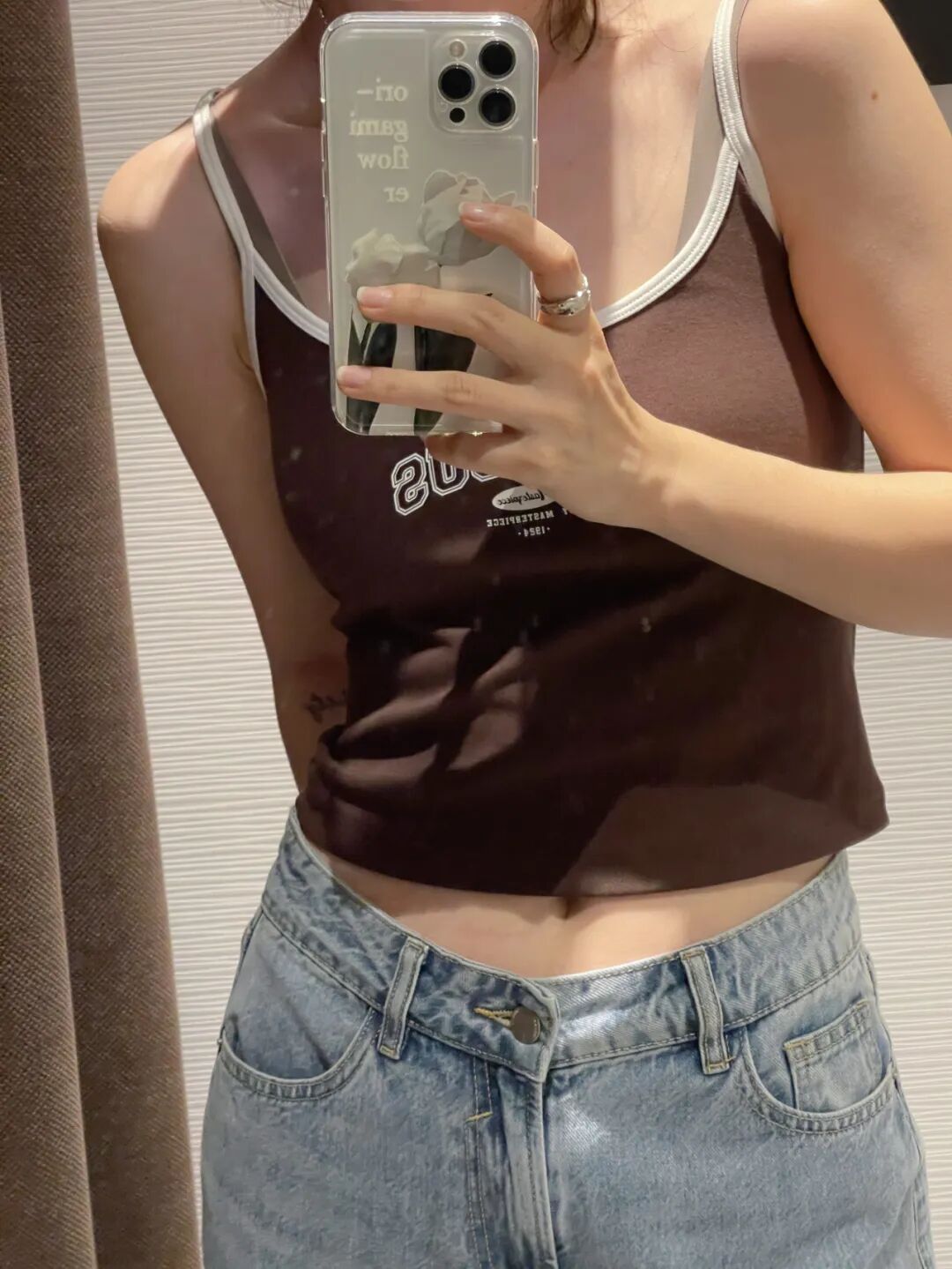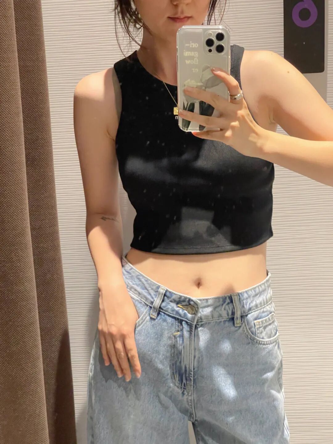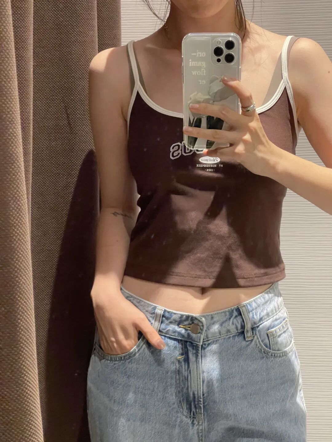 我觉得大家也不必太在意自己身上的肉,衣服自己穿着舒服+开心就好。这件小背心搭配高腰牛仔裤穿,露出一点皮肤真的超酷!