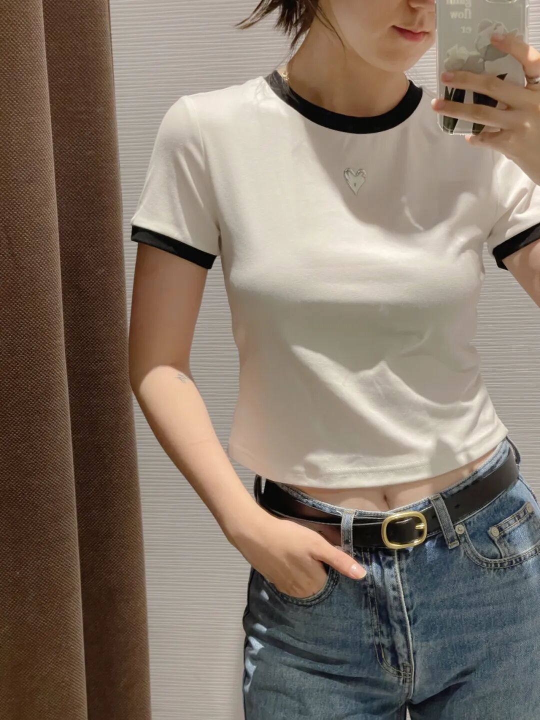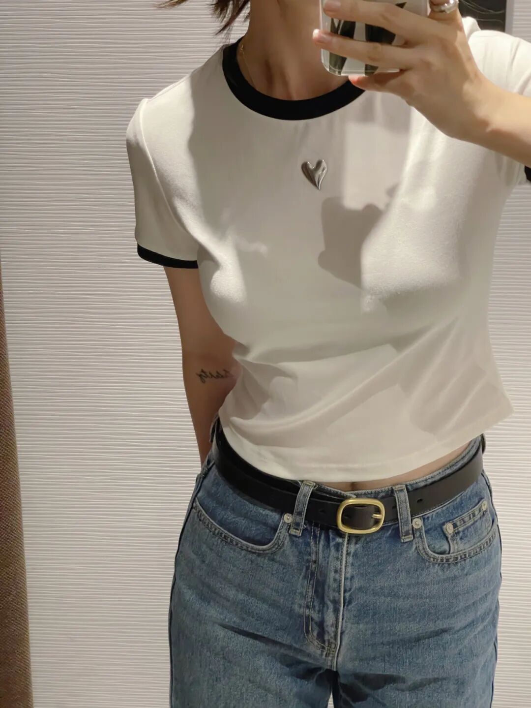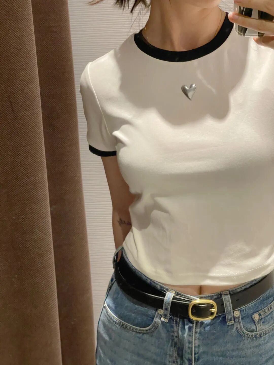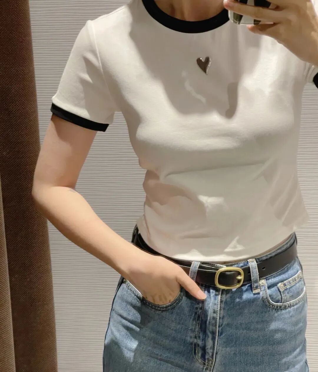 衣服版型很简单,但是黑色撞边、银色的立体桃心,都是塑造穿搭的关键元素,随便一条牛仔裤/牛仔裙搭配就很好看。