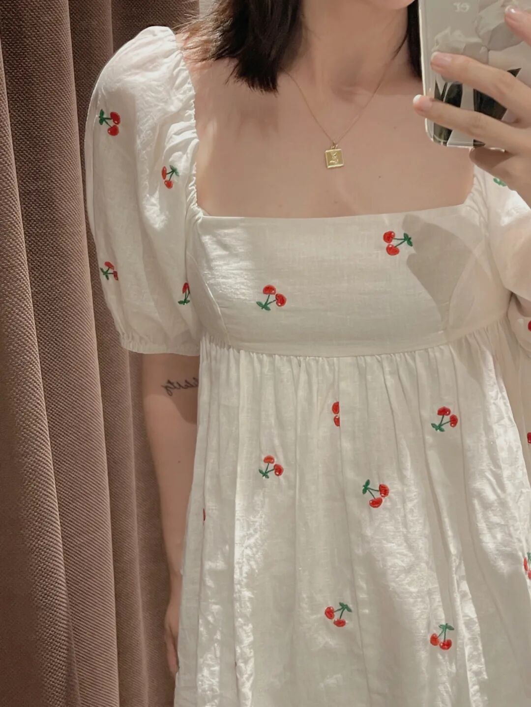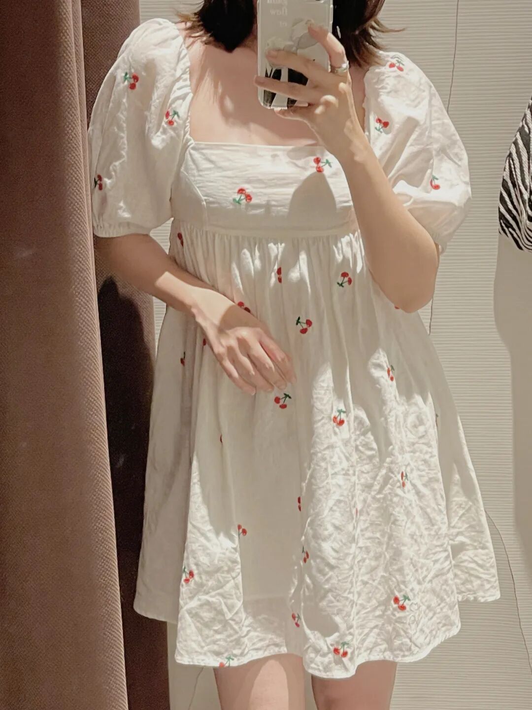 这件小个子一定要冲!樱桃连衣裙看起来特别清新夏天。虽然是泡泡袖,但不显胖,面料是轻薄透气,偏柔软的那种,所以不会显肩宽,也不显壮。