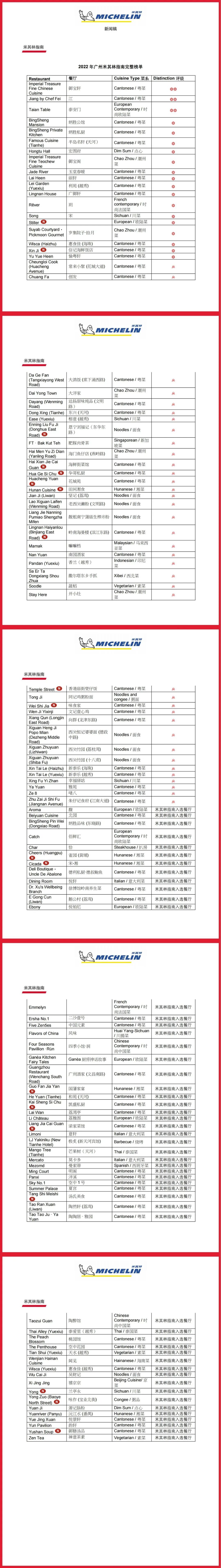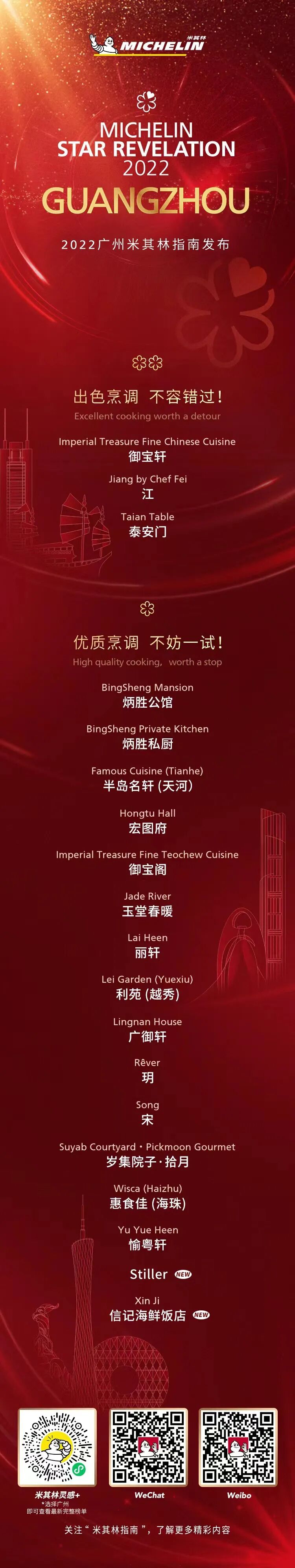“广州坐拥‘中华美食之都’和‘国际美食之都’双料称号。在过去5年,米其林指南一直在广州寻找宝藏餐厅,宝藏厨师以及宝藏美食文化,广州这座城市,传统与潮流相携并进,多元化的菜系共同发展,脱落出独特的广州美食风貌,这些都充分体现在我们日益丰富的榜单上。”米其林中国区总裁、首席执行官叶菲说。
