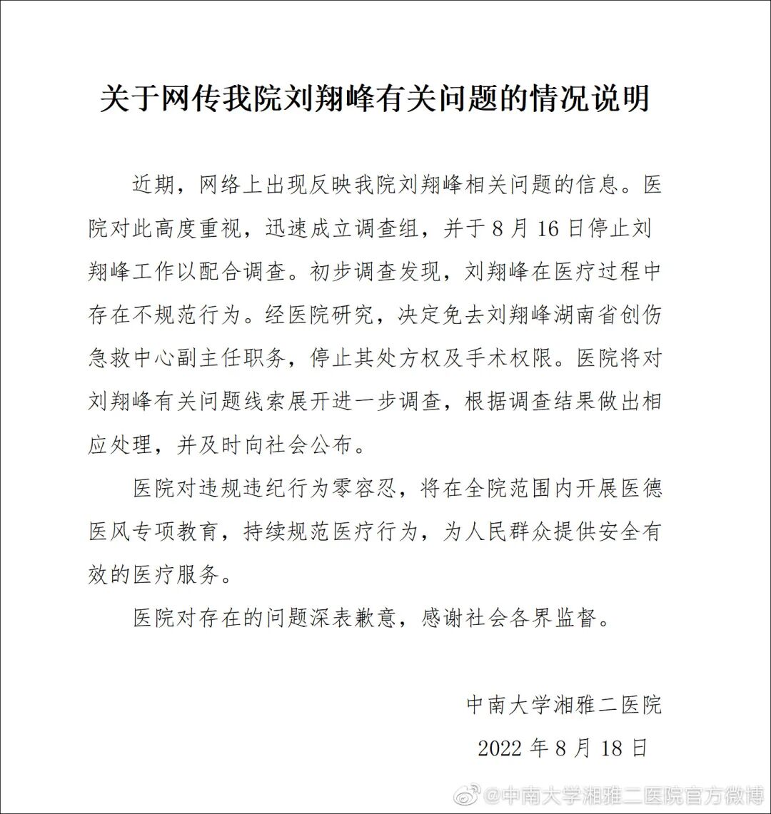 “只要稍微有点异物倾向,不管是不是肿瘤,一律按肿瘤处理,先做化疗。再比如,机器人做不完全性肠梗阻,开进去找不到梗阻段,就把正常肠管切下来给家属看。”网友爆料中南大学湘雅二医院医生刘翔峰存在医疗作风问题后,本人终于回应了。“如果有任何问题,请直接联系我们医院的宣传部门。”据顶端新闻·河南商报报道,记者联系时,刘翔峰如是回答。多位内部人士表示,网上盛传的一些信息基本是真实的,只是没有那么夸张。一名曾在刘翔峰手下轮岗实习的湘雅二医院内部人士称,刘翔峰在很多化疗病人没有明确指征情况下,便给他们多开药,而且大多时候手术都是别的医生在做,刘翔峰上台不久就匆匆离去。刘翔峰不管什么手术都会开具一堆自费耗材,对于癌症晚期没有手术指征的病人,也会做腹腔开关,平白增加病人痛苦。此外,顶端新闻·河南商报记者从一位曾经在中南大学湘雅二医院任职多年的医生处了解到,他在该医院工作期间,听说过一些关于刘翔峰的事情,包括网上爆料出来的信息。“很多都是院内众所周知的事情。”“刘的口碑在湘雅不太好,听说是有靠山,很多有正义感的医护都无可奈何。”这名医生说。“那是他的个人行为,而且目前已经在调查了。”该医护人员表示,湘雅二医院大部分医生是值得信任的,大家不会也不愿意去“冒天下之大不韪”。经过初步调查后发现,刘翔峰在医疗过程中存在不规范的行为。随后医院研究决定,免去刘翔峰湖南省创伤急救中心副主任职务,停止其处方权和手术权限。顶端新闻·河南商报记者了解到,作为监管部门的湖南省卫健委,已经联合中南大学成立调查组,针对此事进行调查。“一旦有结果,将及时向社会公布。”湖南省卫健委工作人员对顶端新闻·河南商报记者说。初步调查发现,刘翔峰在医疗过程中存在不规范行为。经医院研究,决定免去刘翔峰湖南省创伤急救中心副主任职务,停止其处方权及手术权限。医院将对刘翔峰有关问题线索展开进一步调查,根据调查结果做出相应处理,并及时向社会公布。医院对违规违纪行为零容忍,将在全院范围内开展医德医风专项教育,持续规范医疗行为,为人民群众提供安全有效的医疗服务。人民网评:湘雅二医院能查出个什么?