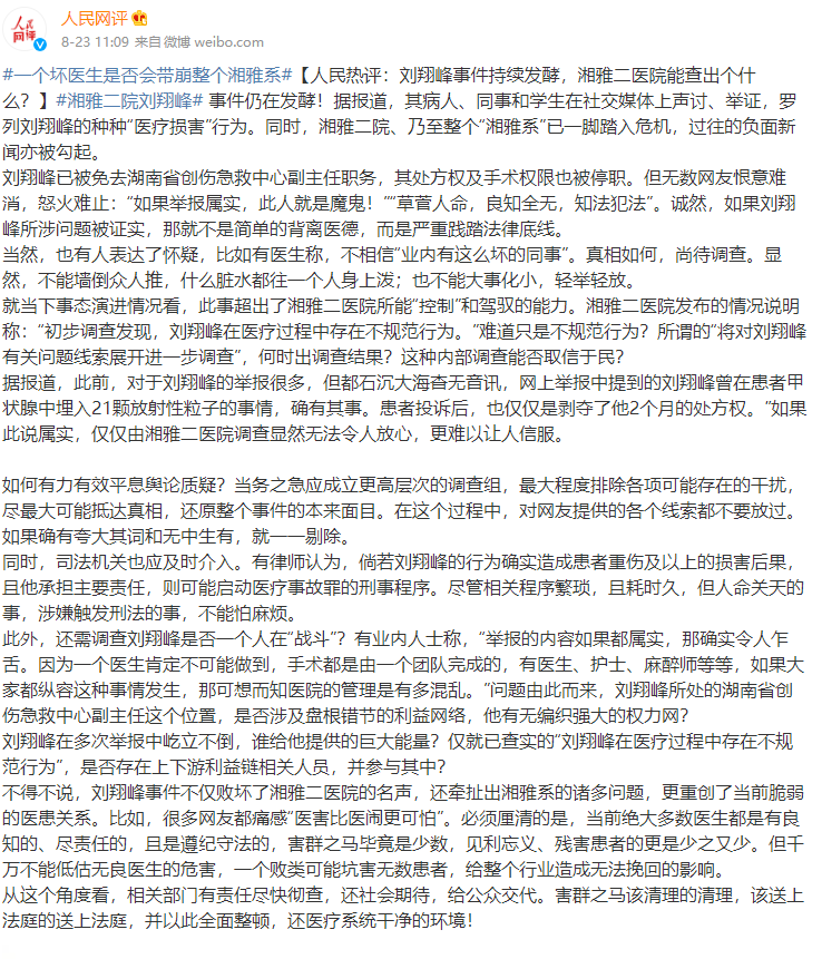 8月23日,人民网评发表微博对上述事件做出评论。评论表示:刘翔峰已被免去湖南省创伤急救中心副主任职务,其处方权及手术权限也被停职。但无数网友恨意难消,怒火难止:“如果举报属实,此人就是魔鬼!”“草菅人命,良知全无,知法犯法”。诚然,如果刘翔峰所涉问题被证实,那就不是简单的背离医德,而是严重践踏法律底线。当然,也有人表达了怀疑,比如有医生称,不相信“业内有这么坏的同事”。真相如何,尚待调查。显然,不能墙倒众人推,什么脏水都往一个人身上泼;也不能大事化小,轻举轻放。不得不说,刘翔峰事件不仅败坏了湘雅二医院的名声,还牵扯出湘雅系的诸多问题,更重创了当前脆弱的医患关系。比如,很多网友都痛感“医害比医闹更可怕”。必须厘清的是,当前绝大多数医生都是有良知的、尽责任的,且是遵纪守法的,害群之马毕竟是少数,见利忘义、残害患者的更是少之又少。但千万不能低估无良医生的危害,一个败类可能坑害无数患者,给整个行业造成无法挽回的影响。从这个角度看,相关部门有责任尽快彻查,还社会期待,给公众交代。害群之马该清理的清理,该送上法庭的送上法庭,并以此全面整顿,还医疗系统干净的环境!![]()
