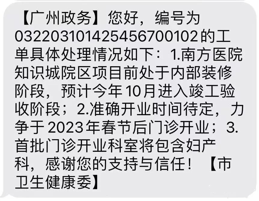 近日,有广州市黄埔区大楼楼盘业主万科幸福悦业主咨询广州市卫生健康委,关于知识城南方医院何时开业的问题,3月17日下午得到官方的回复。