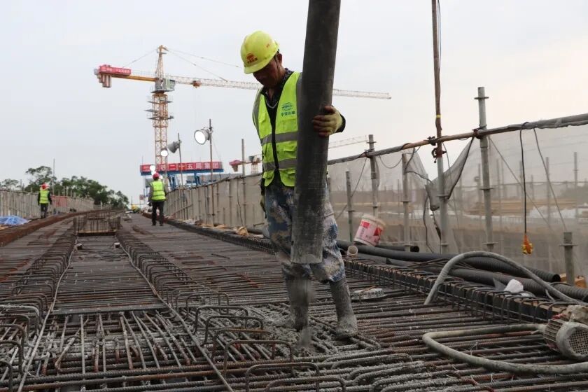 该现浇连续梁处于市区车流量密集的多条道路交汇处,施工安全风险极高。为保障交通、施工安全,建设者在施工前多次召开方案分析会,精心组织部署,优化工、料、机等资源配置,并积极与当地交通部门对接,增加交通疏解人员,浇筑作业时对临近路段进行暂时管控。施工过程中,施工方安排专职安全员盯控交通安全,并定期对脚手架、临近高压线等关键风险源排查隐患,在浇筑时安排专人盯控,将风险降到最低。
