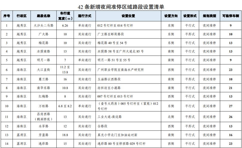 为进一步缓解市民群众临时停车需求,根据《广州市停车场条例》有关规定,经市交通行政主管部门、市公安机关交通管理部门和中心六区人民政府同意,广州市道路事务中心自2022年8月15日起,将开展新增夜间准停区域路段设置工作,在越秀区大沙头二马路、海珠区大江直街等42条路段增设夜间准停区域(准停时段为当日21:00至次日7:00),可供1114台车辆在准停时段内免费停放。广州市道路事务中心将按照设置计划逐条实施夜间准停区域起止点标线划线和指示牌安装,完善起止点标线和指示牌即投入使用。如遇恶劣天气等不可抗力因素,夜间准停区域的设置工作将按实际情况调整或延后。具体设置安排如下:8月15日至20日新增白云区、荔湾区夜间准停区域路段白云区10条:金信路、景云路、云港路、华英路、彩滨南路、彭上德兴路、启德路、黄石北路、富康路、兆丰路;8月21日至27日新增越秀区、天河区、黄埔区夜间准停区域路段越秀区5条:大沙头二马路、广大路、梅花路、水荫南路、明月一路;天河区11条:天荣路、天河北街、龙诚街、林和西横路、华就路、华利路、华成路、华讯街、汇景北路、水荫四横路、翰景路;黄埔区5条:新瑞路、尖塔山路、南翔一路、科林路、海云路。海珠区7条:大江直街、蕙兰路、南华东路、红梅路、万松路、昌岗西路(鹤洞桥底)、永翠路。请广大车主在停放车辆时务必留意现场道路交通标识、泊位标线设置情况,避免因停在非准停区域而出现的违停或影响道路交通通行的情况。本文转载自广州市道路事务中心;版权归原创者所有,如有侵权,请后台联系删除。爆料、商务合作请后台联系。![]()
