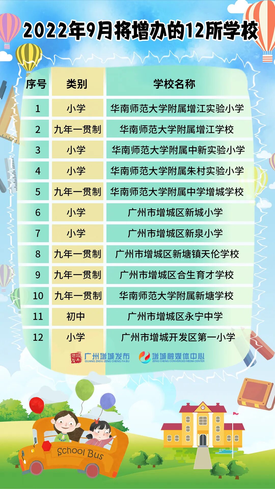 学校位于新塘镇实验中学东侧、广园路南侧、东部交通枢纽,办学性质为公办小学,设小学36个班,可提供学位1620个。今年计划招生270人。 该校为公办九年一贯制学校,负责义务教育小学阶段、初中阶段教育教学工作。新增初中办学规模:初中24个教学班,可提供学位1200个。今年计划招生初中200人。 该校为公办九年一贯制学校,负责义务教育小学阶段、初中阶段教育教学工作。新增初中办学规模:36个教学班,可提供学位1800个。今年计划招生初中300人。 学校位于增城区星图花园项目内,办学性质为公办九年一贯制学校。办学规模:小学42个教学班,可提供学位1890个;初中21个教学班,可提供学位1250个。今年计划招生初中200人。 学校位于永宁街誉山国际五区,永宁街永平路80号。办学性质为公办初中,设初中30个班,可提供学位1500个。今年计划招生500人。 学校位于宁西街的佳兆业悦峰小区,办学性质为公办小学,设小学48个班,可提供学位2160个。今年计划招生360人。本文转载自广州东部发展战略、增城区融媒体中心、增城区教育局基教科,版权归原创者所有,如有侵权,请后台联系删除。爆料、商务合作请后台联系。![]()