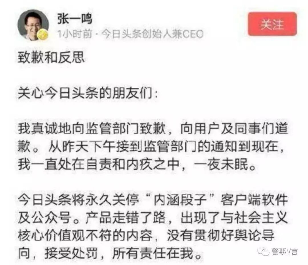 2018年4月10日,国家广D总局发布处理决定,对今日TT网站的内涵DUAN子永久关停。一石激起千层浪,这个苦苦经营了六年多的产品被冠上低俗产品后被永久关停,叫好声一片。今日头条CEO的道歉信,在网上广为传播。