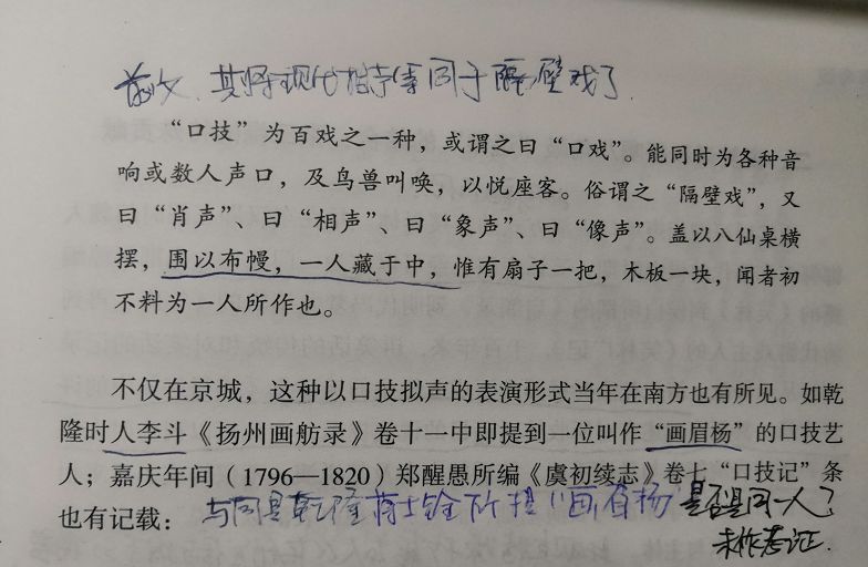 再有,其既然引用了《清稗类钞》文献中“隔壁戏”的文字,又明确称之为“暗春”,而对照其对“明春”与观众面对面表演——“做或者做功性的演,于相声艺术而言,几乎属于可有可无甚而可以忽略不计的构成与存在”这一观点,甚是令人费解。在吴文科同志的脑海里是否将“暗春”“明春”表演等同了呢?这种自相矛盾的表述,使人不禁想起一句网络流行语:别走得太快,等一下灵魂的脚步!