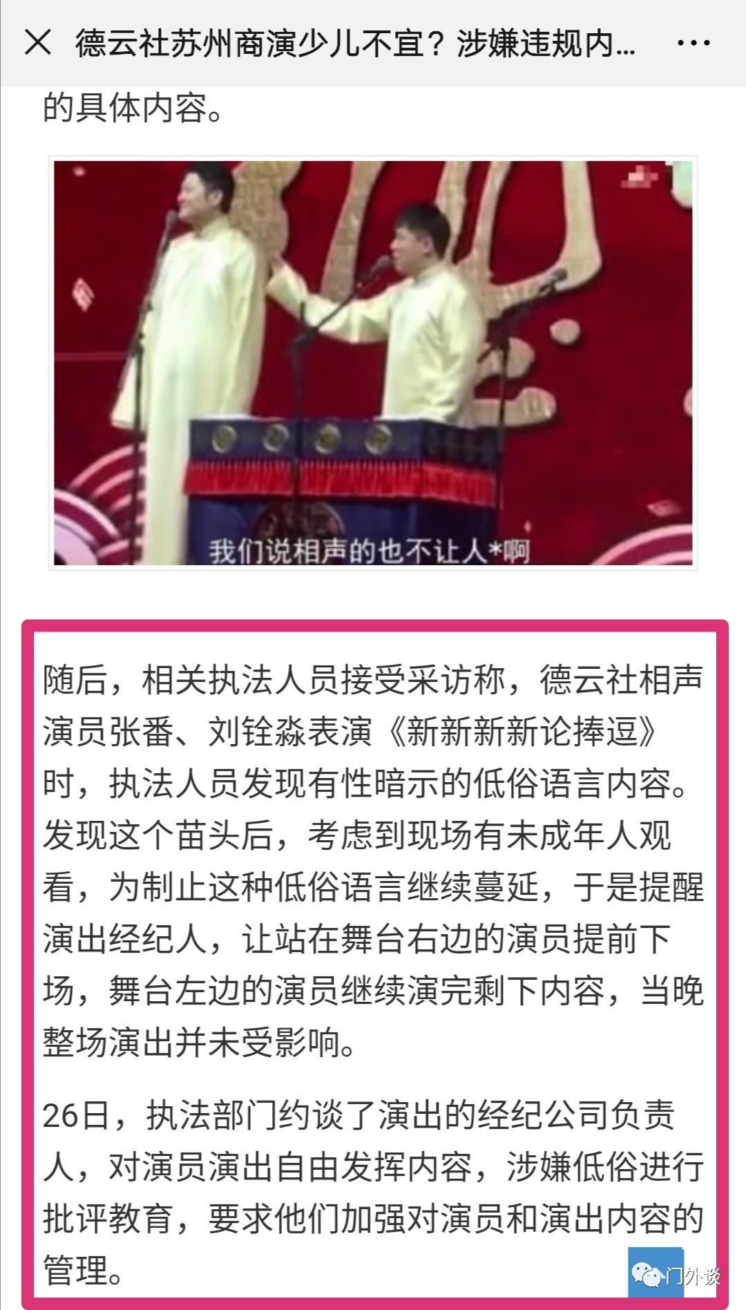 2019年8月29日的公众号发布了关于德云社在苏州专场被当地文化执法部门叫停低俗表演的消息,新京报立即采访了当地执法部门的相关人士: