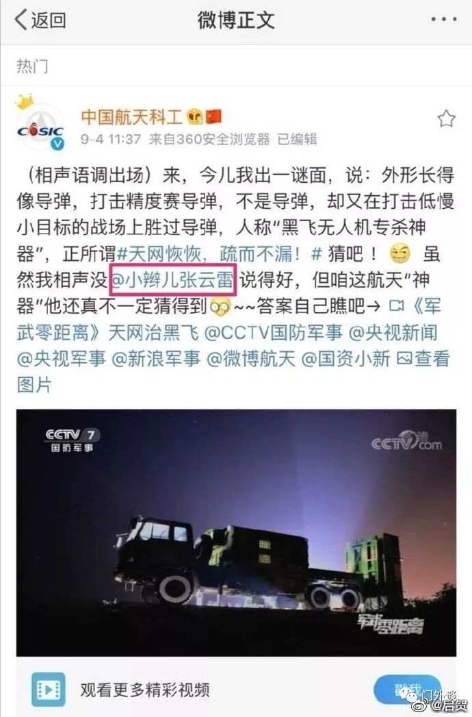 你@中国航天科工 不仅相声说的不好,也是不懂网不上网的典型。这种强蹭热度的文字,凸显了小编以及所在党委的无知与浅薄。请不要把祖国的军事强大与低俗放在一起,这属于高级黑。