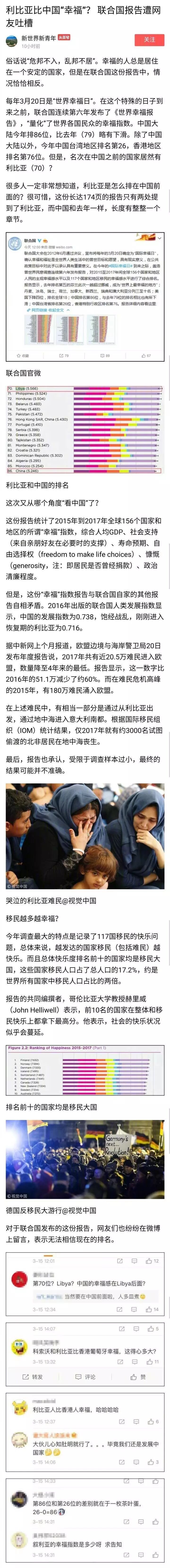 【《世界幸福报告》出炉 利比亚排名高于中国】据@环球时报 ,@联合国 连续第六年发布《世界幸福报告》,“量化”了各国民众的幸福指数。中国大陆排86位,中国台湾地区26位,香港地区76位。利比亚却以第70的名次跃居中国和中国香港地区之前。