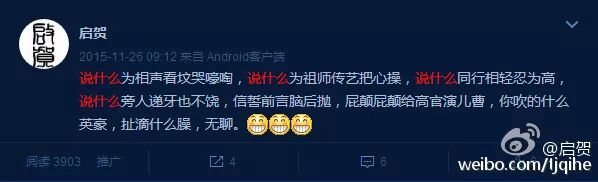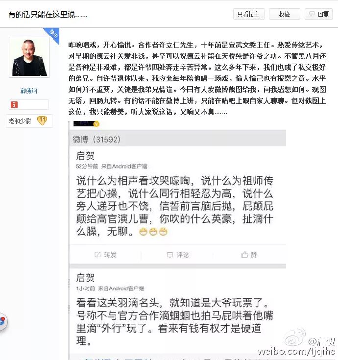 当初和至今也没啥名气的普通相声业余爱好者,郭教主竟然单开微博去骂一骂,最可笑的是,骂得语无伦次,然后还自己删博……