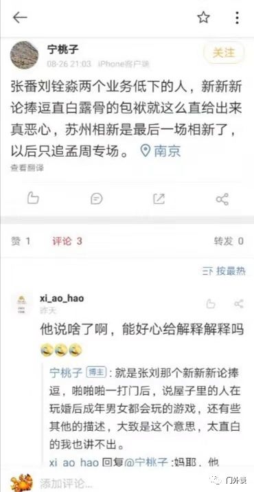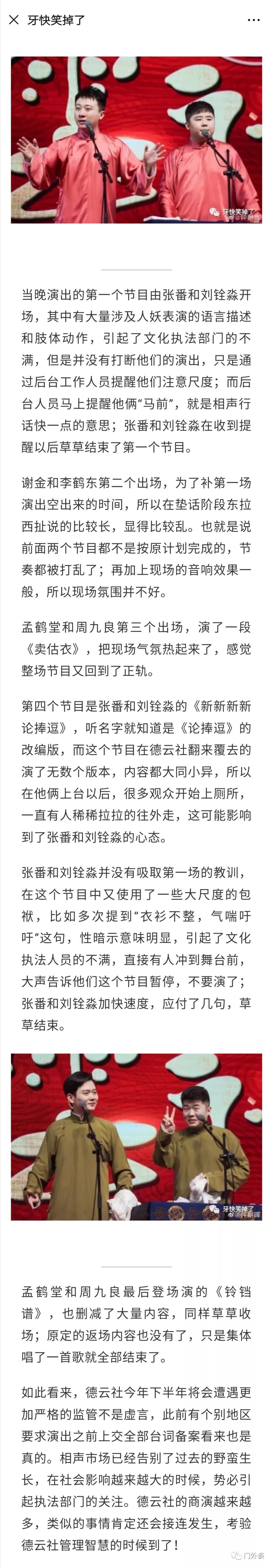 虽然不完全赞同以上转发截图中的内容,但“偏见小姐说娱乐”指出的“而在出了问题以后,德云社的演员想到的不是如何改正错误,反而先想到的是封锁消息”倒是符合这个低俗单位的一贯表现。而怀疑张番、刘铨淼是卧底,也许透露出了一丝真相: