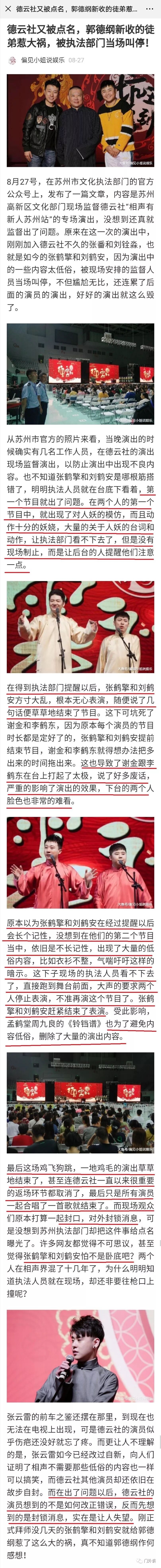 苏州文化综合执法部门公众号的文字对于德云社演出违规问题语焉不详,据消息灵通人士的透露: