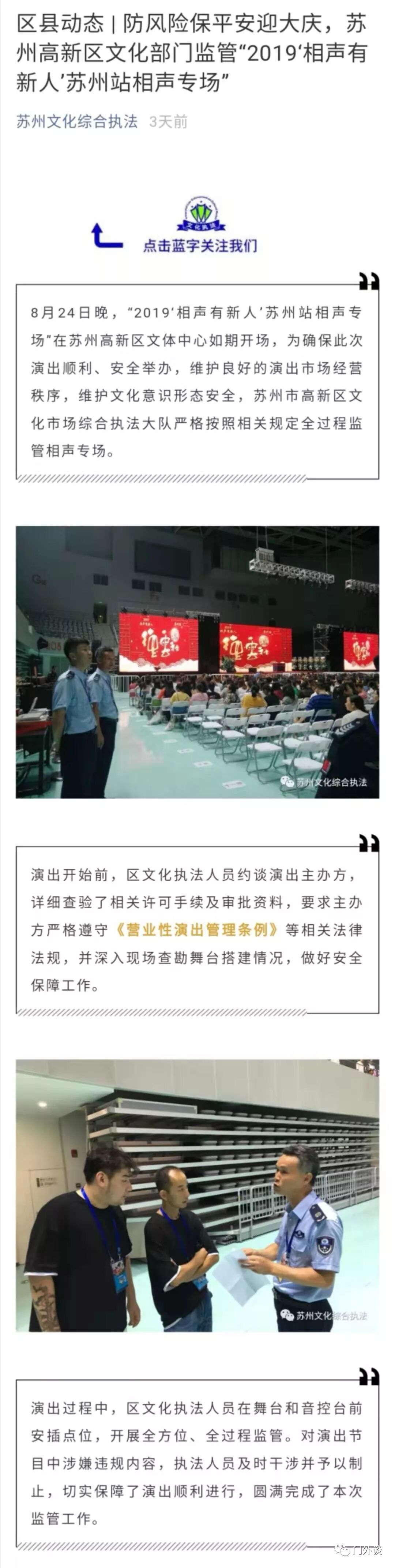 2019年8月26日,公众号“苏州文化综合执法”发布了题为:区县动态 | 防风险保平安迎大庆,苏州高新区文化部门监管“2019‘相声有新人’苏州站相声专场”的文字: