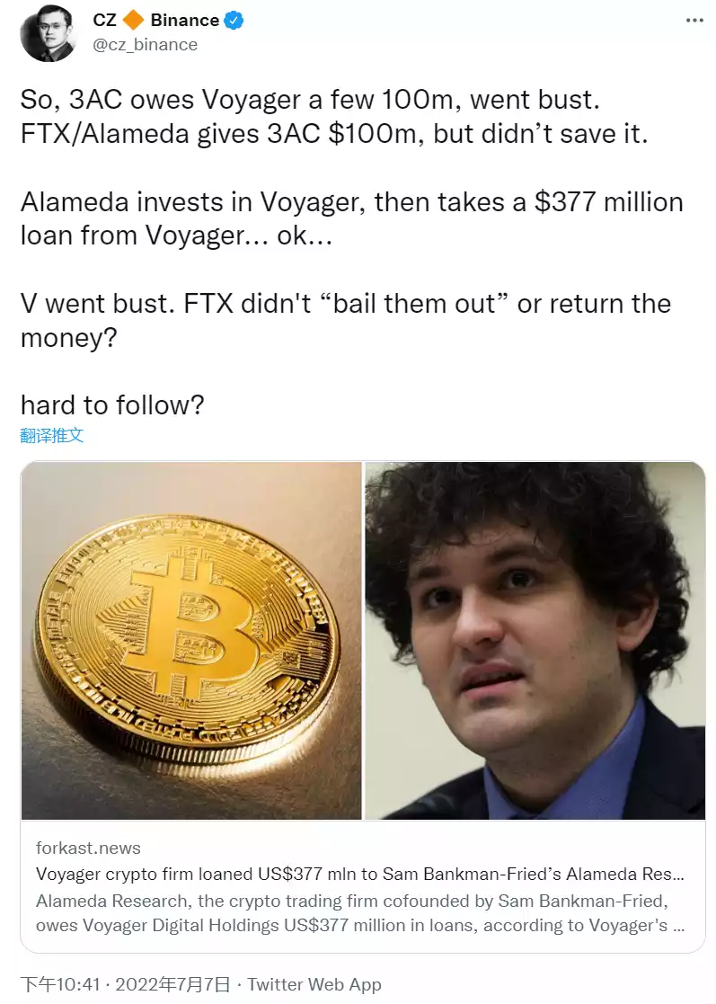 当时,赵长鹏暗讽,3AC欠Voyager数亿美元导致Voyager破产,(FTX旗下)Alameda投资了Voyager并从Voyager贷走了3.77亿美元,为什么FTX不还钱救助破产的Voyager,而是给了3AC没什么作用的1亿美元救助?内涵SBF没钱了。