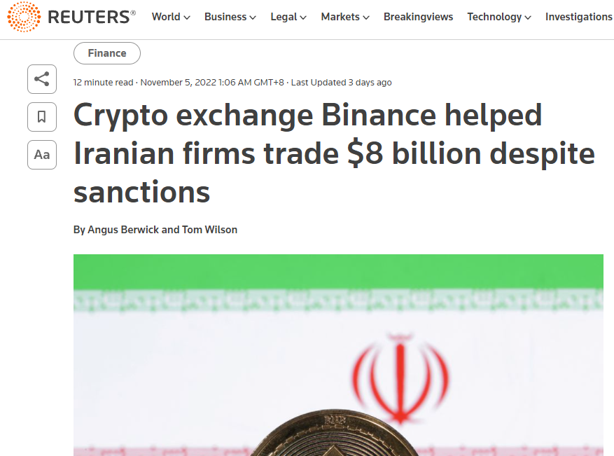 11月5日,路透社发文《尽管受到制裁,加密货币交易所币安帮助伊朗公司交易了80亿美元》,此文被多位分析师解读为FTX对币安的攻击。