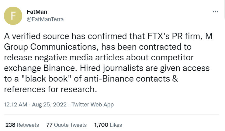 擅长黑料的博主FatMan在8月25日的推文中表示“经核实的消息来源证实,FTX的公关公司M Group Communications已签约发布有关竞争对手交易所币安的负面媒体文章。受雇的记者可以接触到反Binance的联系人和参考资料的‘黑皮书’,以便进行研究。”