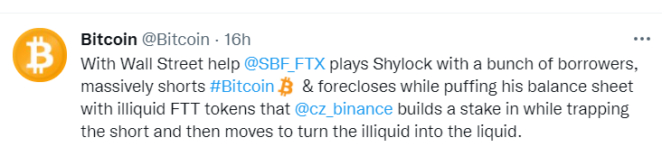 11月7日,Bitcoin官方推文指出,SBF在华尔街资金的帮助下大规模做空比特币,通过质押没有流动性的FTT放弃赎回权做大资产负债表,借此从加密市场抽取资金。CZ(赵长鹏)建立质押仓锁住空头将其持有的FTT重获流动性。