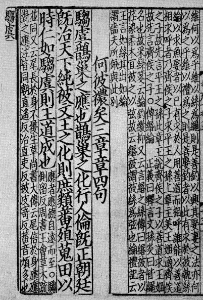 《驺虞》篇形态的第三次转换涉及早期的“艺”如何被儒学化的问题。这是《驺虞》篇的第三种传解。驺虞为嘉瑞仁兽之说,相关记载也非常丰富。最具代表性的是《毛传》,言驺虞“义兽也。白虎黑文,不食生物,有至信之德则应之”。另外,《驺虞》篇《小序》言:“《驺虞》,《鹊巢》之应也。《鹊巢》之化行,人伦既正,朝廷既治,天下纯被文王之化,则庶类蕃殖,蒐田以时,仁如驺虞,则王道成也。”当然,《毛传》的讲法也是有所承继的,比如更早的《山海经》,稍晚些的《淮南鸿烈》《尚书大传》所载。