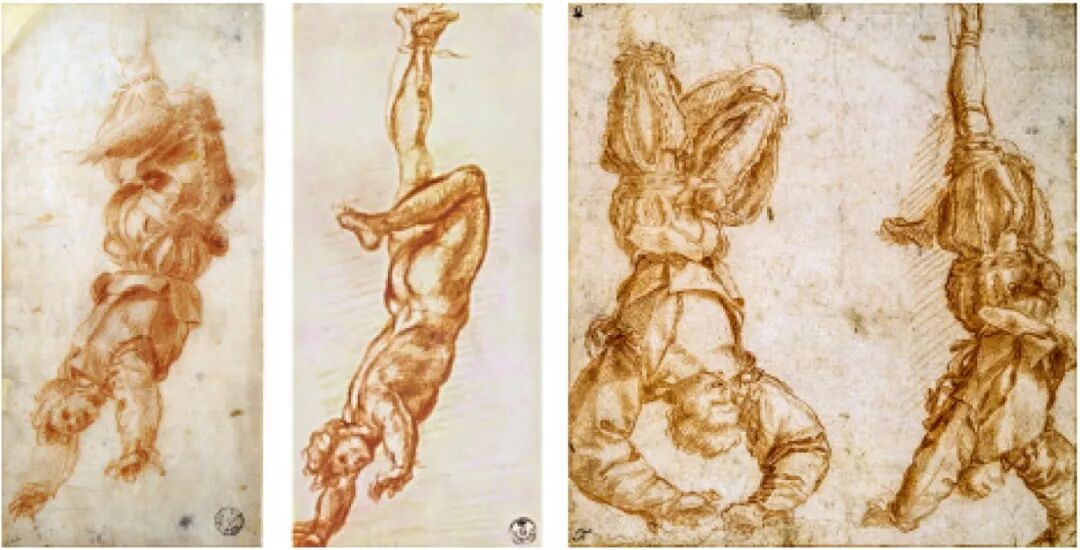 进而,看一下1530年的一个毁谤图系列,也许可以帮助我们更好地理解艺术家对毁谤图的“艺术介入”。1527年,西班牙军队洗劫罗马,朱利亚诺·德·美迪奇的非婚遗腹子、教皇克莱芒七世(Pope Clement Ⅶ,1478—1534)被迫放弃了对佛罗伦萨的宗主权;1529年,克莱芒借调西班牙军队围攻佛罗伦萨,佛罗伦萨有三位佣兵指挥官阵前倒戈,然后城市里有三个家族也叛国,执政团决定使用毁谤图,请雕刻家桑德罗·迪·洛伦佐(Sandro di Lorenzo,1483—1554)雕刻了倒吊像;同时还委托了两组毁谤图,一组是三个市民叛徒被画在监狱巴杰罗宫的墙上,另一组是三个佣兵军官被画在别的建筑上。两组画像委托给了当时在佛罗伦萨最有名的画家安德烈亚·德尔·萨托(Andrea del Sarto,1486—1530),瓦萨里描述说,因为不愿像卡斯塔格诺那样获得“倒挂人”的绰号,萨托对外宣称已将这项工作交给了一名学徒,而实际上他自己到晚上就偷偷爬上脚手架,亲笔完成了这些“栩栩如生”的肖像。按同时代历史学家贝内代托·瓦奇(Benedetto Varchi,1502—1565)的记录,巴杰罗宫墙上三位市民叛徒的画像是倒挂人的形象,且每幅画像下面写有犯人及其家族的名字,并被称为“卖国贼”。这些图画也已经消失,但乌菲齐保存有萨托为此准备的七幅素描,有裸体的,也有穿着衣服的。这些姿态各异的形象与其说是刑罚的再现,还不如说是艺术家对姿势和人体的研究,是对身体动态的艺术把握。