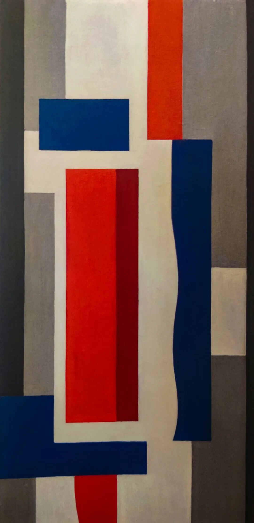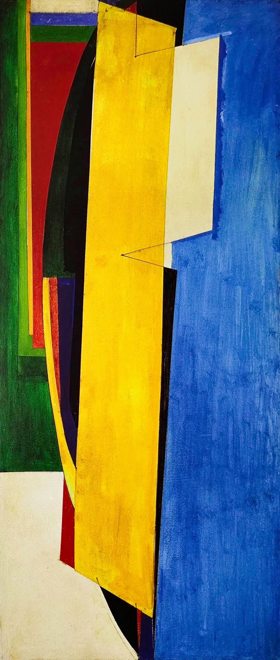 霍夫曼也经历了莱热这样的历程,即对壁画和架上绘画的区分逐渐含混。在钦博特项目草稿中,他践行了这种“大面积对比色”的运用:颜色的丰富度相对简单,色彩近乎纯色,数量多控制在五种以内。《纽约时报》(New York Times)评论家艾琳 · 萨里宁(Aline Saarinen)在评论《壁画家和现代建筑师》展时,大加赞赏了霍夫曼对白色的大面积使用,认为它们是令人愉悦的必不可少的声部(obbligato)。对“装饰性活力”的追求,使得霍夫曼这批作品在视觉上强烈、清晰、不晦涩。需要注意的是,这批作品虽然都被冠以“壁画”的称谓,但它们的创作媒材依然是油画,实际的尺幅也只有两米左右,只能算尺幅较大的架上绘画。因此霍夫曼对壁画装饰性活力表达的实质,是对架上绘画装饰性活力的探索。这就不难理解,为什么未来几年里,霍夫曼的架上绘画反复出现钦博特项目草稿所呈现出的壁画风格。在钦博特项目同年创作的“色彩体积”系列中,可以看到霍夫曼对装饰性活力探索的延续:黄色、红色、绿色、蓝色大面积被运用,色彩与色彩之间的边界十分清晰,线条的作用极弱,只起到调节作用,霍夫曼对所谓“大面积对比色的平衡”的使用,甚至比钦博特项目壁画还要夸张。这并不是说霍夫曼放弃了架上绘画中的交响乐式活力,而是他尝试将壁画创作探索中的成功经验借鉴到架上绘画之中。