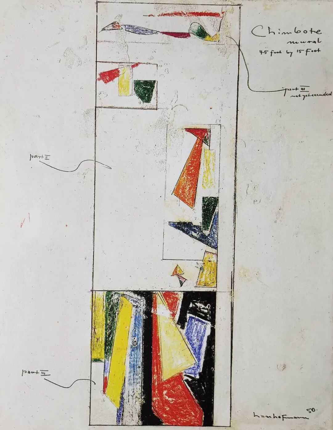 1950年,为了“点亮公众被1930年代为公共事业振兴署(Works Progress Administration)广泛绘制的装饰壁画所浸染的眼睛”,霍夫曼的签约画廊主塞缪尔 · 库兹(Samuel Kootz)组织了一次名为《壁画家和现代建筑师》(Muralist and the Modern Architect)的展览。此次展览中,霍夫曼与西班牙建筑师约瑟夫 · 赛特(Josep Sert)合作,负责在其已规划好的钦博特项目基础上进行创作。该规划设置有一块“市民中心”(civic center),中心的主体是一个露天广场,广场周边围绕着各种建筑,其中包括一座教堂。教堂紧贴广场,靠近广场的一侧竖立一块混凝土板(slab),正对着广场,与教堂隔空相伴,相当于传统宗教建筑中的钟塔。霍夫曼被邀请设计的是混凝土板上的壁画和广场的地面铺装(图1)。