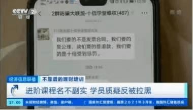 今年4月,央视便曾曝光在线理财课堂“十倍学堂”存在虚假宣传、诱导消费、承诺收益、无法退款等现象。据央视报道,张女士在花费1元加入十倍学堂的“理财小白营”后,又花费7999元购买其进阶课程,但很快张女士发现进阶课程效果不好后提出退款时,却被以各种理由拒绝退款,甚至被拉黑。