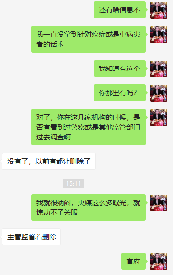四、问询是否能提供针对重病患者、癌症患者的话术,财商老炮(知情人士)告诉我们,此前是有的,不过后面都被删除了,因为惧怕工商、公安对公司进行突查,抓个现行就完蛋了!(此前微淼的老师就告诉有专门针对癌症患者的话术,但是我们目前还有获得,有微淼或是其他机构的老员工希望你们可以联系我们提供这个文档,我们将移交给公安机关!)