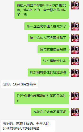 六、财商老炮(知情人士/离职老师)分析财商课针对人群:分层的精准营销特别清楚,宝妈、家庭主妇、老师、负债的等等,主要针对穷人、让其家庭雪上加霜、家里打架的、闹离婚的、喝药的都很多(其实财商课的头部几家、包括巨头的财商机构的相关负责人都从事过互联网金融P2P、地方金融、境外金融、现货等投资领域,现在的定位是降维打击,从骗高净值人群到现在针对穷人为主的新型诈骗手法,第一看准穷人无权无势,第二诈骗金额不高,不容易闹大,如同曾经流行过的“微盘”一样,据我们分析微淼就是名字就是来源自微盘的启发!)