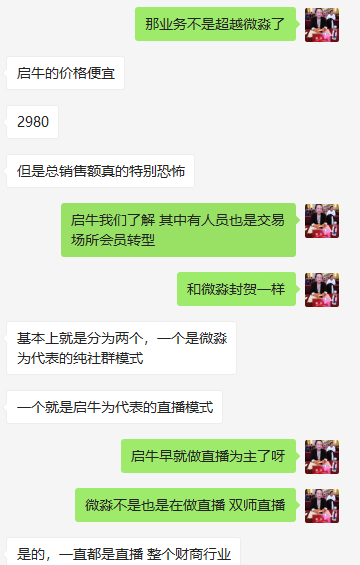 三、财商老炮(知情人士/离职老师)称启牛带一期1200学员,此前在微淼一期带200学员,启牛小白营0元,微淼此前12元(现在7元),而启牛进阶课2998年(没有超过3000元,这个是一根法律红线,过了这个可以立案,低了这个一般不立案),微淼是6998。老炮分析,其认为启牛利润已经超过了微淼!(我们此前认为微淼还是头牌,现在看微淼也在积极模仿启牛的直播间模式看样子启牛或许和微淼比较接近了)