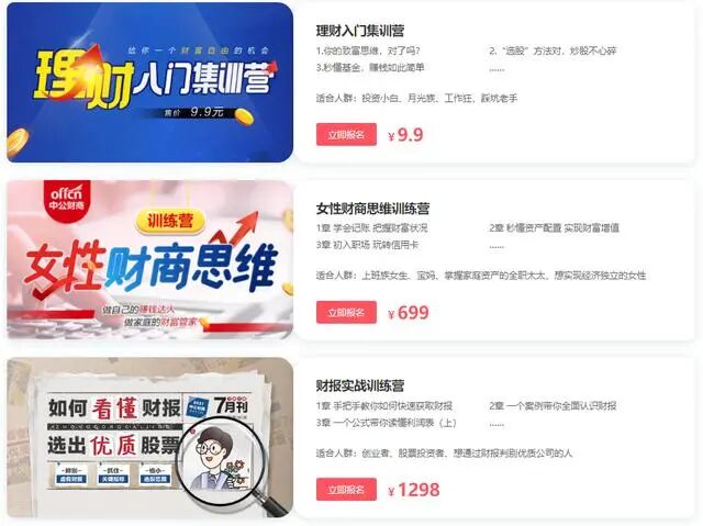 中公财商官网目前上线有6门付费课程,分别是“理财入门集训营”“女性财商思维训练营”“财报实战训练营”“基金实战训练营”“股票实战训练营”“财富增值VIP组合课”,除了入门课程价格为9.9元外,其余课程课单价从699元-4998元不等。