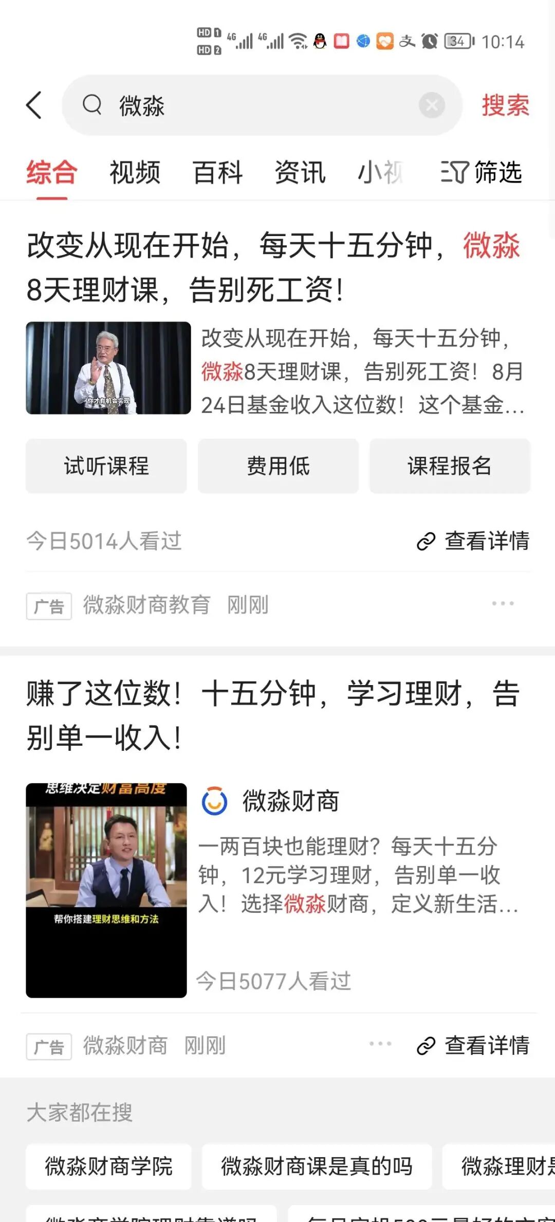 百度搜索“微淼”,第一页内容几乎都是“12元12天”“0基础也能变为理财高手”“教你如何从1万到100万的理财方法”的广告。